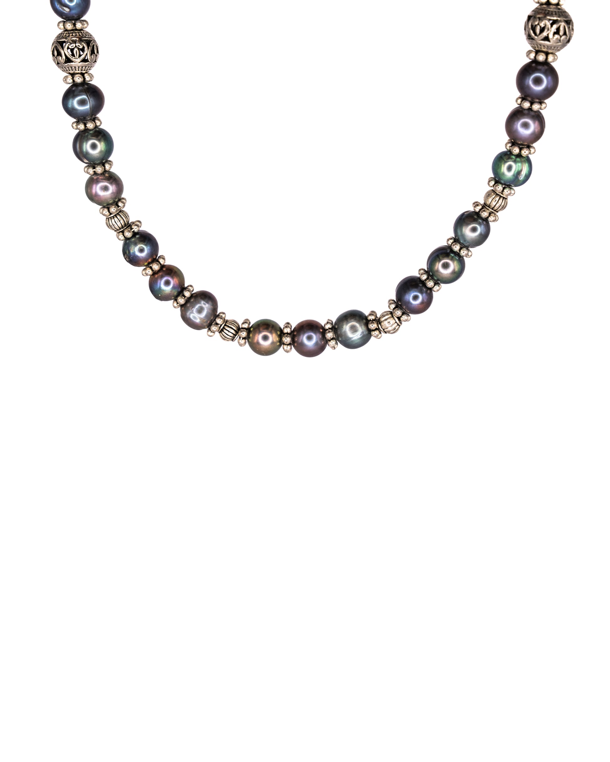 This elegant necklace features a full strand of smooth, lustrous black pearls, creating a continuous flow of timeless beauty. The rich, deep hue of the black pearls is perfectly complemented by the sleek stainless steel chain, adding a modern twist to a classic design.