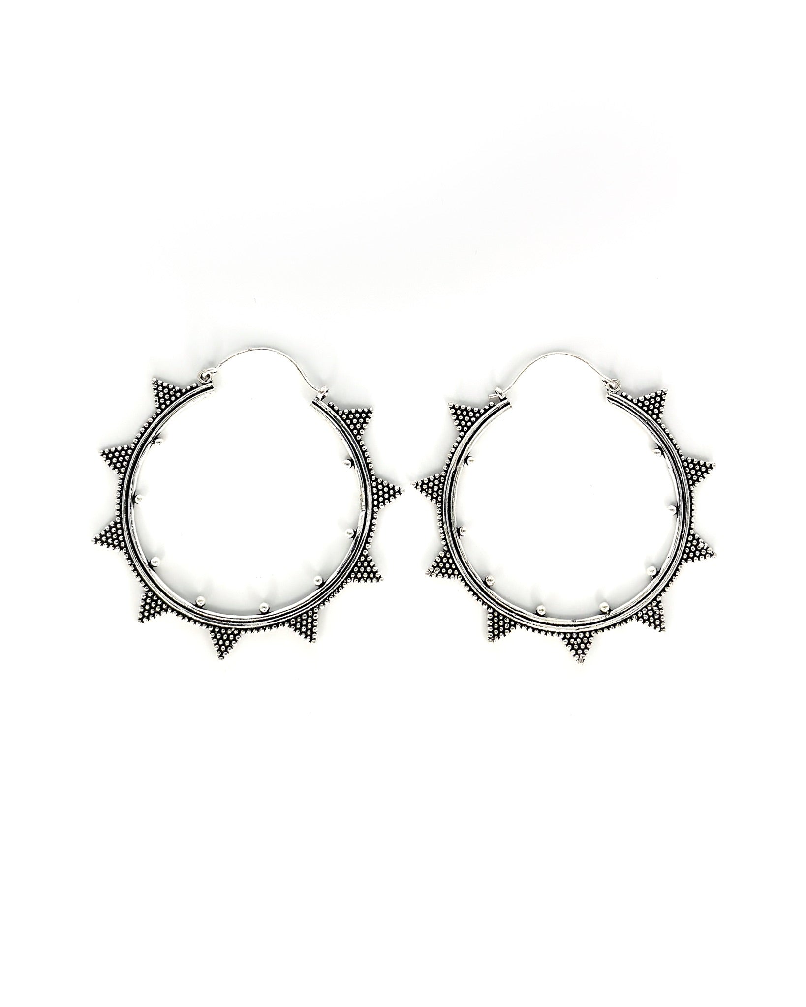 These handcrafted earrings feature a bold tribal-inspired design with intricate patterns, creating a unique and edgy statement piece.