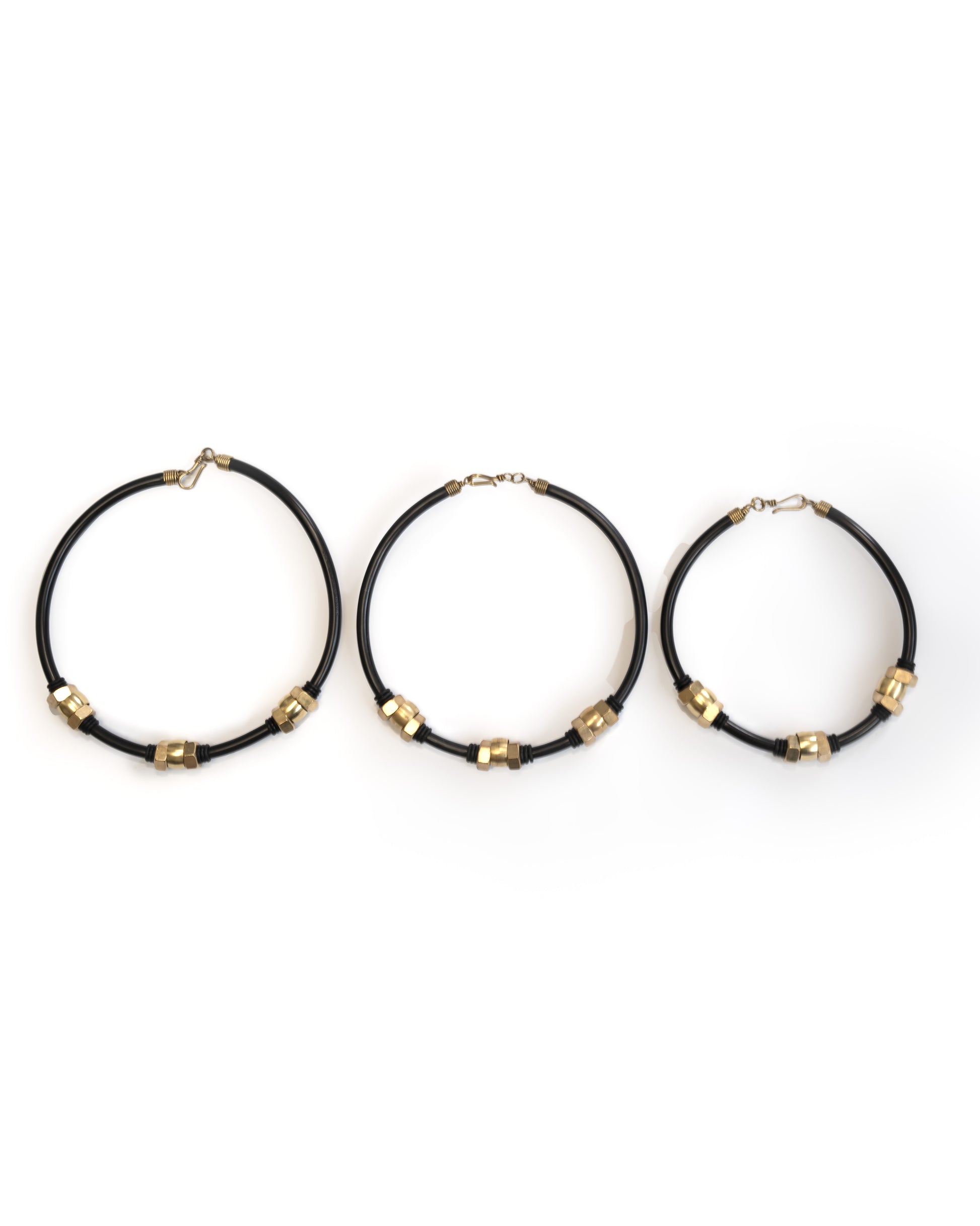 From Mauna Khea’s exclusive collection, this bold necklace features a sleek black tube strung with carefully arranged brass beads, creating a striking, minimalist design. The combination of dark and metallic elements offers a modern, tribal-inspired aesthetic. Each necklace takes several days to handcraft, ensuring every bead and detail is perfectly placed for a one-of-a-kind look.