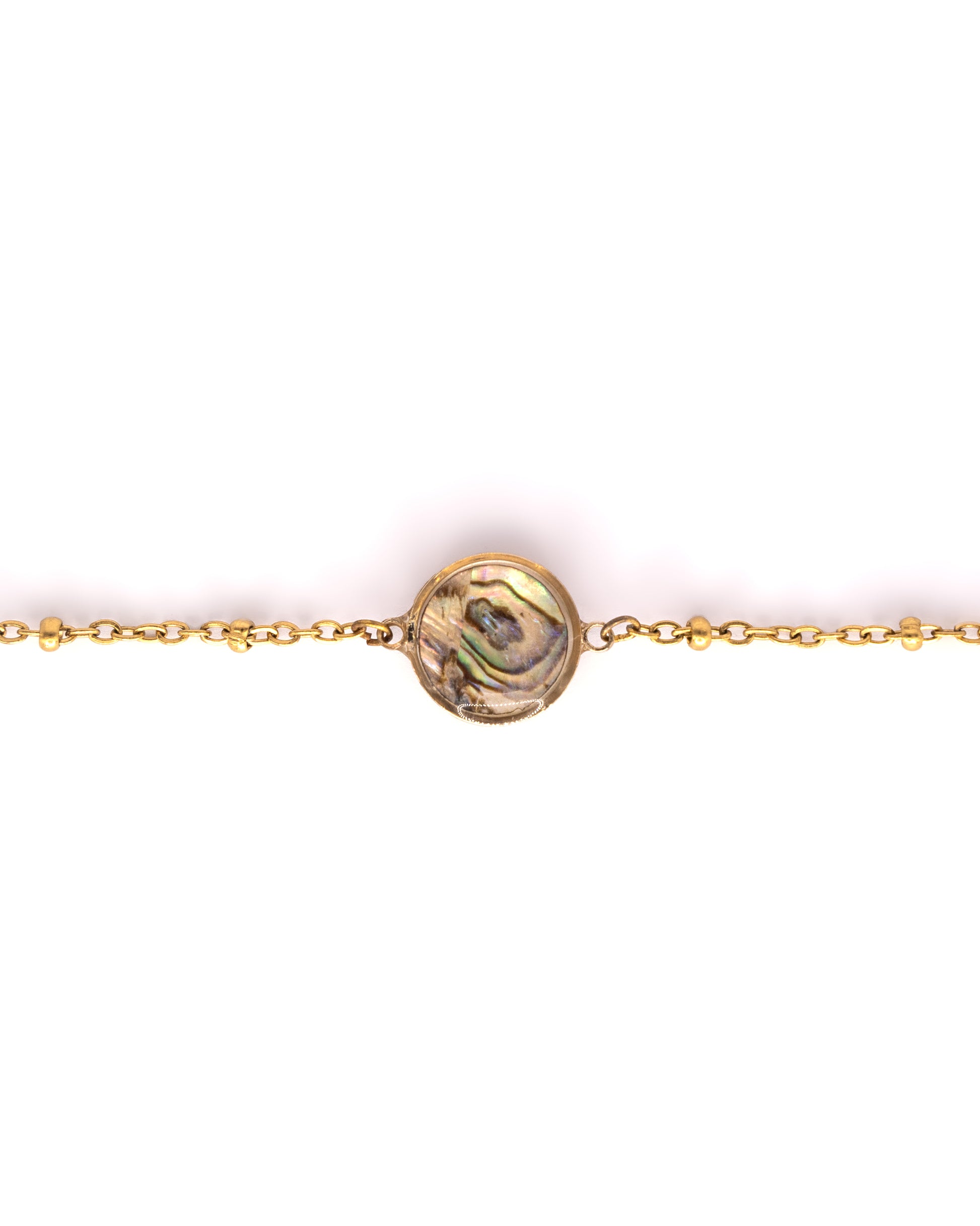 This elegant bracelet features a golden stainless steel chain, highlighted by a beautiful freshwater pink pearl and an iridescent abalone centerpiece, creating a striking contrast of natural beauty and luxurious design.