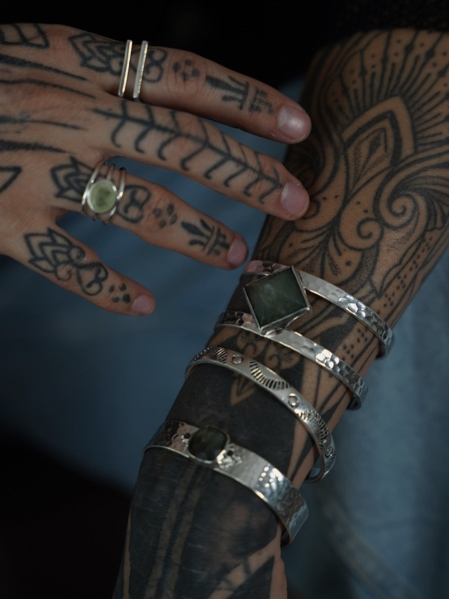 These meticulously handcrafted bangles feature exquisite green agate stones, celebrated for their deep, vibrant hues that evoke tranquility and harmony, set in a timeless hammered design with vintage-inspired elegance.