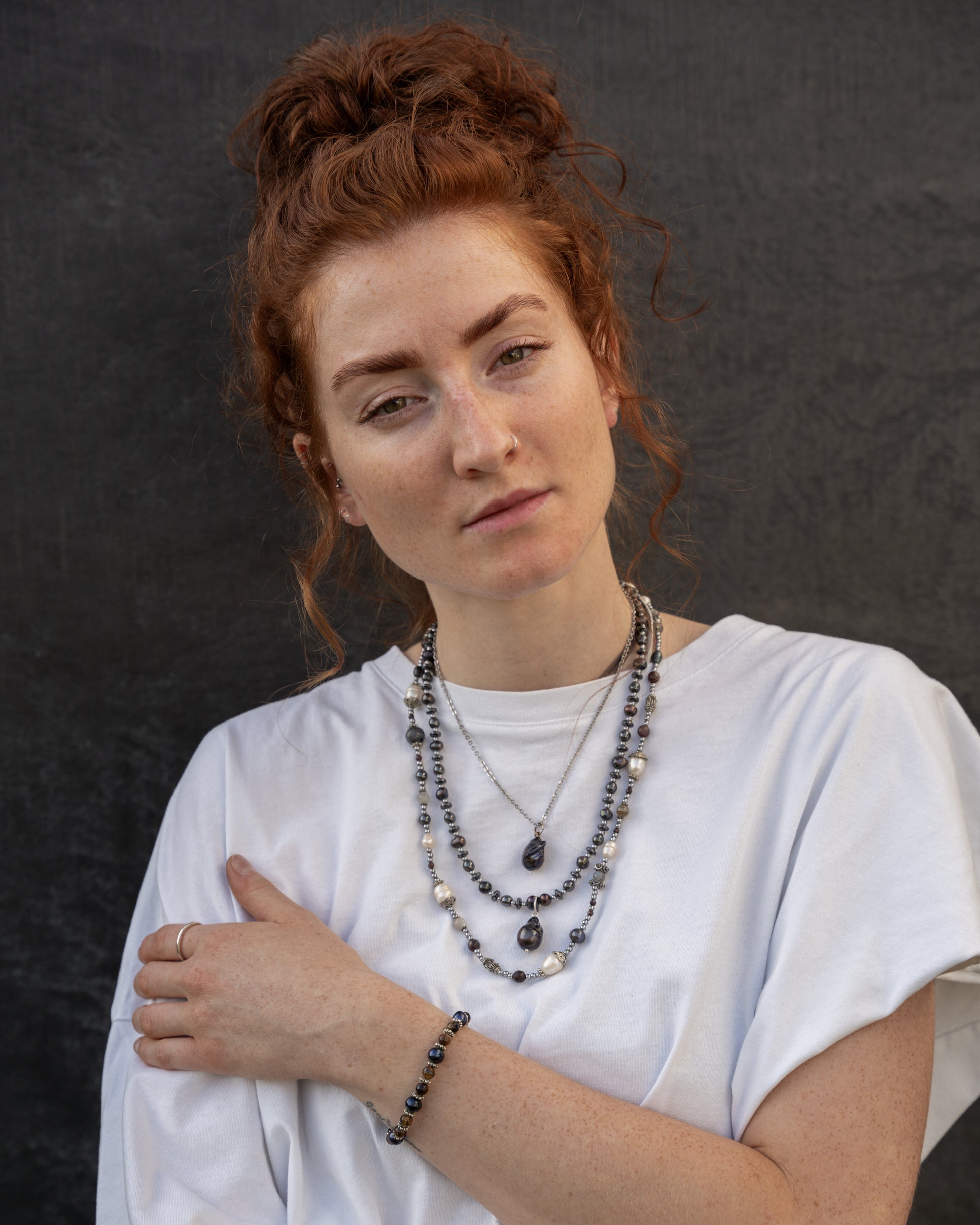 • White pearls, garnet, and labradorite beads for a perfect balance of elegance and earthy beauty