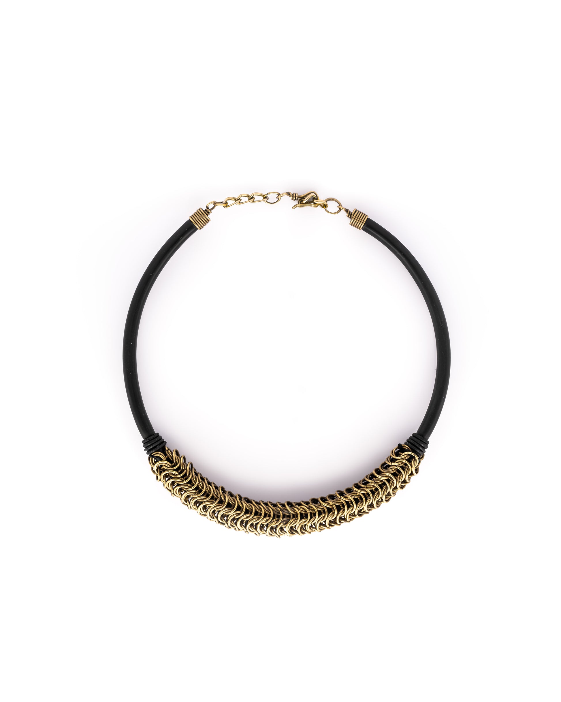 From Mauna Khea’s exclusive collection, this bold necklace features an abstract design inspired by reptile scales, meticulously crafted on a sleek black tube. The piece is adorned with hand-arranged brass rings, creating a striking, tribal-inspired aesthetic. Each necklace takes several days to craft, ensuring the intricate scale pattern and every brass ring is carefully placed to achieve a unique, one-of-a-kind design.