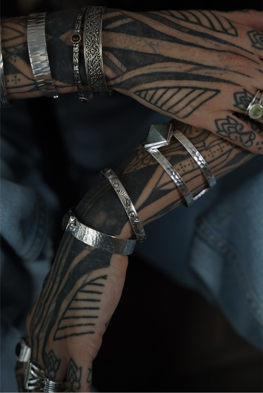 This handcrafted bangle features a bold ornamental design, embellished with intricate patterns for a timeless and striking look—perfect for stacking or wearing solo.
