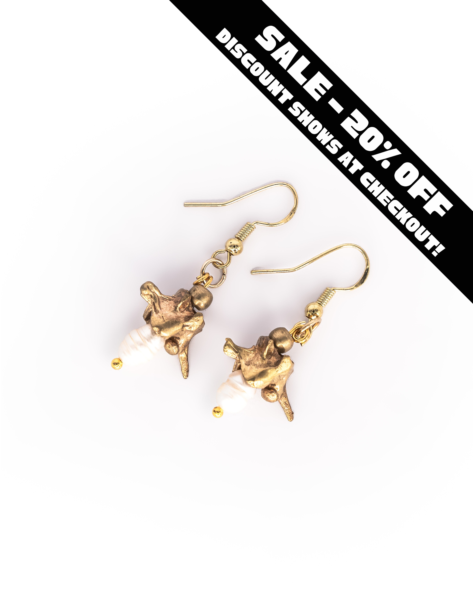 These elegant earrings feature authentic snake vertebrae beads paired with smooth white pearls, all set in polished brass for a refined, minimalist look. The combination of natural elements and sleek brass creates a simple yet striking design, perfect for adding a subtle touch of sophistication to any outfit.